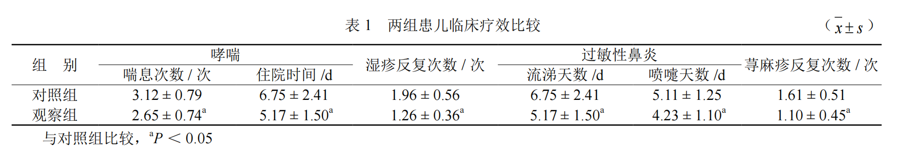 治疗后,观察组喘息患儿发作次数及需住院时间、鼻炎患儿出现鼻涕、打喷嚏天数,湿疹患儿反复发作次数均明显比对照组低,观察组血清IgE值与对照组比较也明显降低。因此,儿童变态反应性疾病加用脾氨肽口服溶液口服可显著降低儿童变态性反应疾病且无明显不良反应。