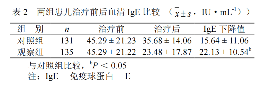 两组患儿治疗治疗后3个月复查血清IgE值,观察组患儿血清IgE值明显降低,组间比较,差异具有统计学意义(P<0.05),见表 2。