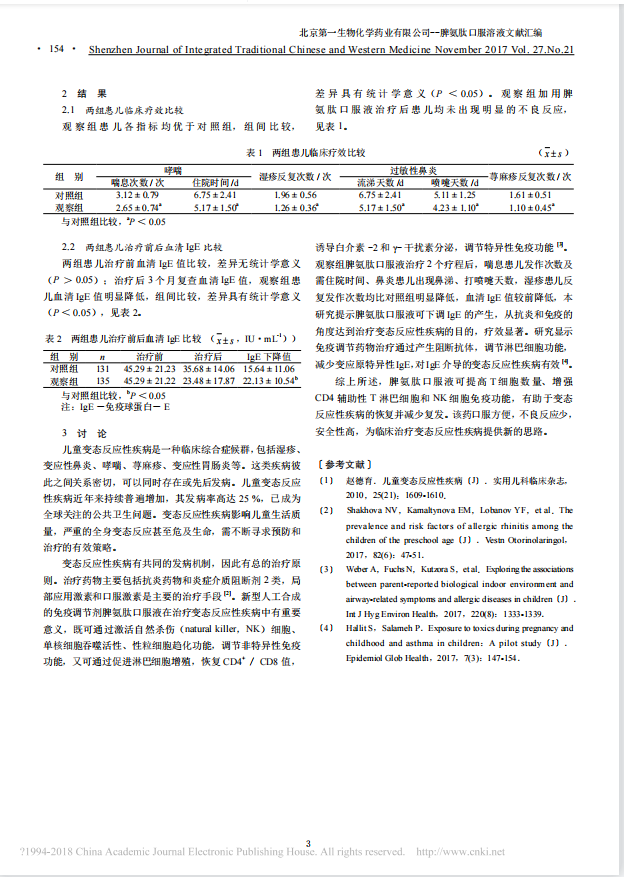 综上所述,在常规治疗加脾氨肽口服溶液治疗2个疗程后,喘息患儿发作次数及需住院时间、鼻炎患儿出现鼻涕、打喷嚏天数,湿疹患儿反复发作次数均比对照组明显降低,血清 IgE 值也较前降低。本研究结果显示,脾氨肽口服溶液可提高T细胞数量、增强CD4辅助性T淋巴细胞和NK细胞免疫功能,有助于变态反应性疾病的恢复并减少复发。该药口服方便,不良反应少,安全性高,为临床治疗变态反应性疾病提供新的思路。
