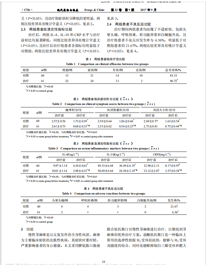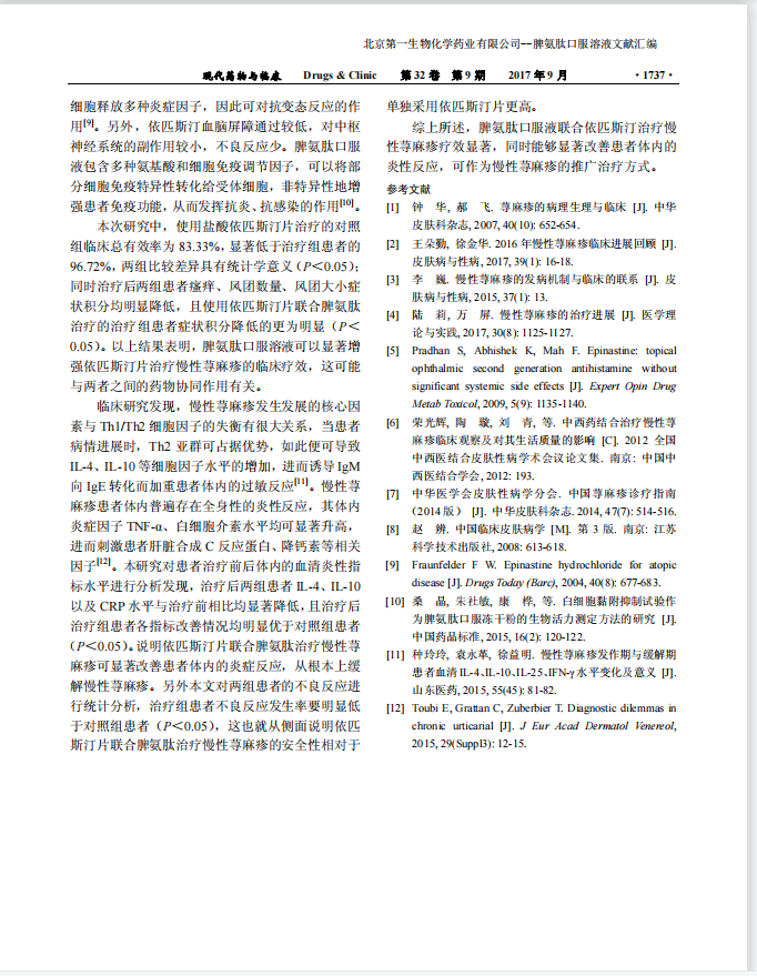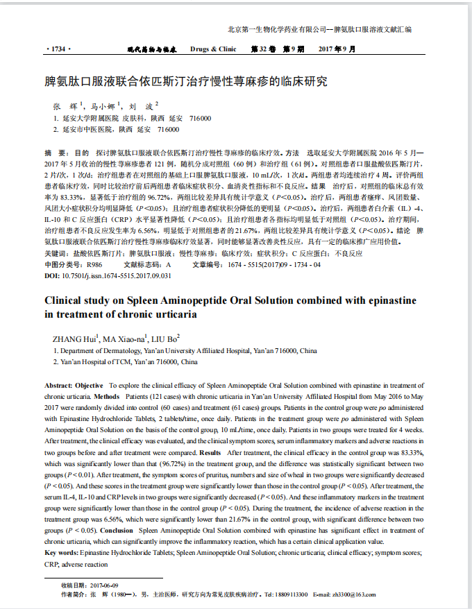 脾氨肽口服溶液包含多种氨基酸和细胞免疫调节因子,可以将部分细胞免疫特异性转化给受体细胞,非特异性地增强患者免疫功能,从而发挥抗炎、抗感染的作用。从研究结果表明,依匹斯汀片联合脾氨肽治疗慢性荨麻疹可显著改善患者体内的炎症反应,从根本上缓解慢性荨麻疹,显著增强依匹斯汀片治疗慢性荨麻疹的临床疗效,这可能与两者之间的药物协同作用有关。