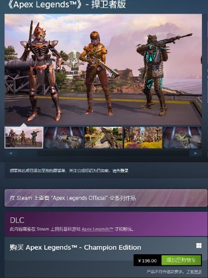 《Apex英雄》现已在Steam国区解锁,游戏免费游玩,捍卫者版售价198元,包含了截止第7赛季的所有角色、三款专属传说英雄皮肤、三款专属传奇武器皮肤、专属传说武器护身符、1000 Apex金币。